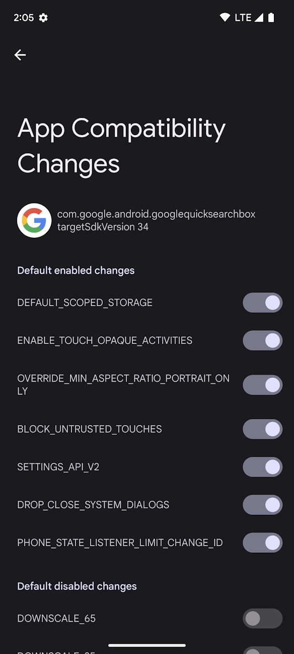 Nella figura 1 noterai anche una sezione chiamata Modifiche disattivate per impostazione predefinita. Le modifiche che rientrano in questa sezione possono servire a una serie di scopi. Prima di attivare queste modifiche, leggi la descrizione della modifica nell'elenco dei framework di compatibilità per quella versione di Android.