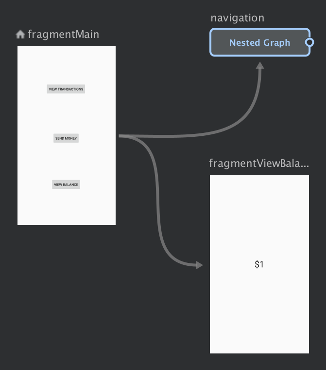 navigationelements along with its own ID and astartDestinationattribute that points to the first destination in the nested graph:<?xml version="1.0" encoding="utf-8"?> <navigation xmlns:app="http://schemas.android.com/apk/res-auto" xmlns:tools="http://schemas.android.com/tools" xmlns:android="http://schemas.android.com/apk/res/android" app:startDestination="@id/mainFragment"> <fragment android:id="@+id/mainFragment" android:name="com.example.cashdog.cashdog.MainFragment" android:label="fragment_main" tools:layout="@layout/fragment_main" > <action android:id="@+id/action_mainFragment_to_sendMoneyGraph" app:destination="@id/sendMoneyGraph" /> <action android:id="@+id/action_mainFragment_to_viewBalanceFragment" app:destination="@id/viewBalanceFragment" /> </fragment> <fragment android:id="@+id/viewBalanceFragment" android:name="com.example.cashdog.cashdog.ViewBalanceFragment" android:label="fragment_view_balance" tools:layout="@layout/fragment_view_balance" /> <navigation android:id="@+id/sendMoneyGraph" app:startDestination="@id/chooseRecipient"> <fragment android:id="@+id/chooseRecipient" android:name="com.example.cashdog.cashdog.ChooseRecipient" android:label="fragment_choose_recipient" tools:layout="@layout/fragment_choose_recipient"> <action android:id="@+id/action_chooseRecipient_to_chooseAmountFragment" app:destination="@id/chooseAmountFragment" /> </fragment> <fragment android:id="@+id/chooseAmountFragment" android:name="com.example.cashdog.cashdog.ChooseAmountFragment" android:label="fragment_choose_amount" tools:layout="@layout/fragment_choose_amount" /> </navigation> </navigation>In your code, pass the resource ID of the action connecting the root graph to the nested graph: