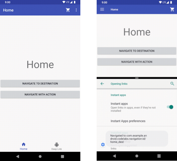 به عنوان ناوبری سطح بالا استفاده می شود که فضای عمودی کافی برای انجام این کار وجود داشته باشد. هنگامی که اندازه پنجره کاهش می یابد، همانطور که در سمت راست شکل نشان داده شده است، پیمایش در سطح بالا با استفاده از یک DrawerLayout