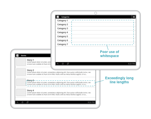 علاوه بر پرداختن به این انتظارات کاربر، اغلب لازم است که محتوای بیشتری را در دستگاه های بزرگتر ارائه کنید تا از ایجاد فضای خالی بیش از حد یا ایجاد ناخواسته تعاملات ناخوشایند جلوگیری شود. در شکل زیر می توانید برخی از مشکلاتی را که هنگام تطبیق طراحی رابط کاربری برای یک پنجره بزرگتر ایجاد می شود مشاهده کنید:
