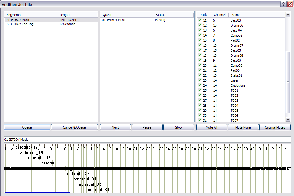 您可以透過「稽核」視窗 長度不限。方法很簡單 提示並按下「佇列」該片段會顯示在佇列視窗中, 開始播放 (如果這是第一個片段)。接著就能選取 然後再加入播放。做為區隔 播放清單中的下一個片段會開始播放。如同 JET Creator 的其他視窗,你可以將靜音、取消靜音、觸發事件片段等。 即時播放。