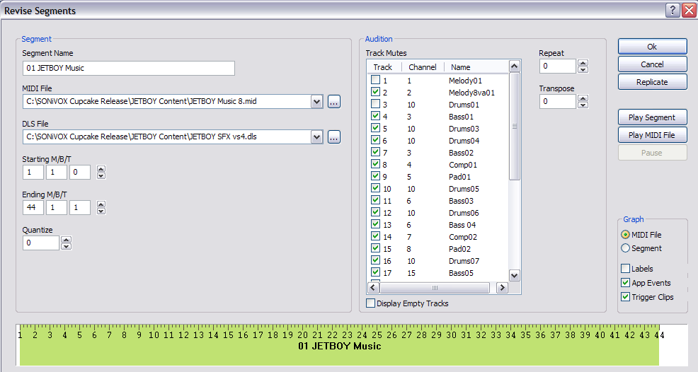 如果您正試圖節省記憶體,請盡量減少撰寫 MIDI 檔案,然後從該 MIDI 檔案建立多個區段。舉例來說,一個含有 4 塊 A、B、C 這三個部分的 12 長條 MIDI 檔案,可以產生更長的歌曲。只要建立多個區隔參照這個 MIDI 檔案,然後視需要排列順序即可。舉例來說,A、A、B、A、C、A、B、A、A 都會生成 36 號酒吧歌曲。使用 JET 新增重複播放片段、轉置片段,以及透過互動方式將音軌靜音和取消靜音,讓歌曲更有趣。