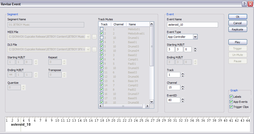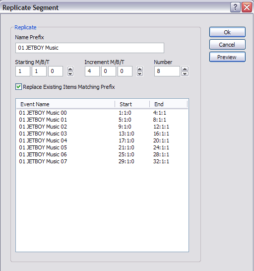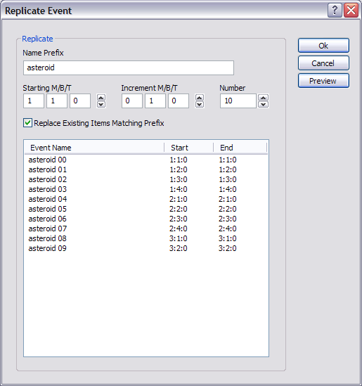Para agilizar a adição de segmentos ou eventos, use o comando "Replicate". Ele pode adicionar vários segmentos ou eventos de uma só vez e usa um parâmetro de compensação e uma convenção de nomenclatura com prefixo para facilitar a leitura. O comando "MOVE" também é útil para mover vários eventos de acordo com um número definido de medidas, batidas ou marcações.