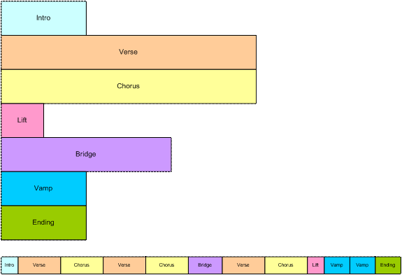 A parte de baixo do diagrama mostra como os segmentos musicais podem ser recombinados para criar uma peça musical linear. Neste exemplo, a ponte pode terminar com uma modulação principal de meio passo e o restante os segmentos podem ser transpostos até meio passo para correspondência.