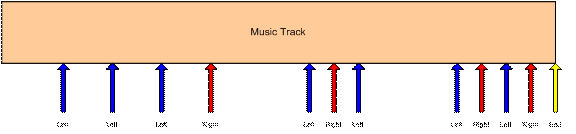 As setas representam eventos na sequência de músicas em que eventos de jogos precisam ser sincronizados. Nesse caso, a seta azul representa um momento em que o jogador deve pressionar o botão esquerdo e a seta vermelha é para o botão direito. A seta amarela informa ao mecanismo do jogo que a sequência está completa. O player tem permissão para iniciar uma determinada janela de tempo antes e depois do evento para pressionar a tecla adequada.