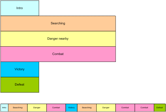 Neste diagrama, vemos uma música não linear pedaço O cenário é um jogo de tiro em primeira pessoa (QPS) e o JET oferece a música de fundo. A introdução é reproduzida enquanto a fase é carregada e, em seguida, faz a transição. sob controle do programa para o segmento de pesquisa. Esse segmento é repetido indefinidamente, talvez com pequenas variações (usando o recurso desativar/ativar som) até que a atividade no jogo exige uma mudança.