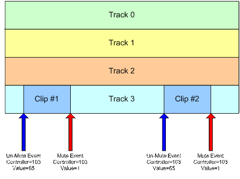 Denetleyici 103, işaretleme için ayrılmıştır tarafından tetiklenebilecek bir MIDI kanalındaki klipler JET_TriggerClip API çağrısı. Klip kimliği, klibin bitimine göre denetleyici değerine ayarlanır. Bit 6, klibin başlangıcını göstermek için bir olarak ayarlanır ve sıfır olarak ayarlayın.