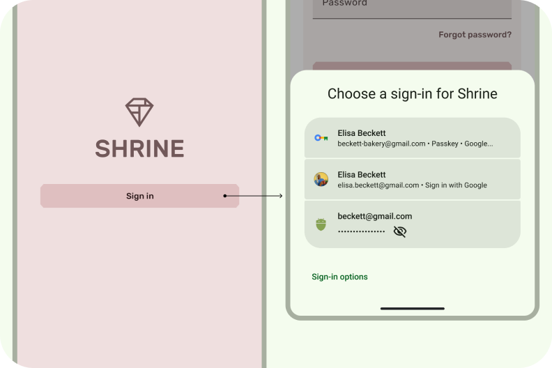 Диспетчер учетных данных позволяет пользователям выбирать любой метод входа (ключи доступа, вход с помощью Google и пароли) в приложении Android. Узнайте, как интегрировать собственное решение поставщика учетных данных.