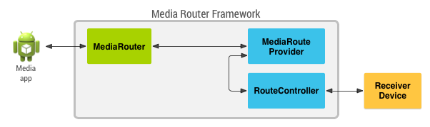The Android media router APIs are designed to enable media display and playback on remote receiver devices using a common user interface. App developers that implement a MediaRouter interface can then connect to the framework and play content to devices that participate in the media router framework. Media playback device manufacturers can participate in the framework by publishing a MediaRouteProvider that allows other applications to connect to and play media on the receiver devices. Figure 1 illustrates how an app connects to a receiver device through the media router framework.