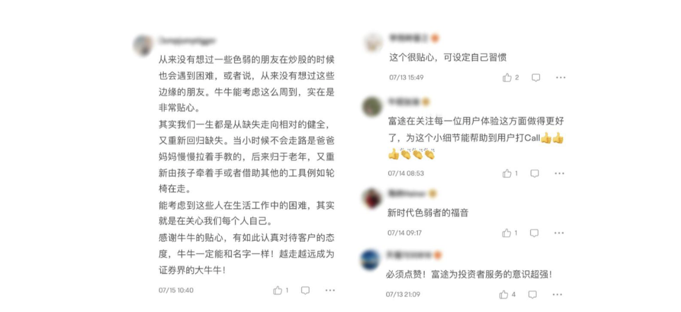เราให้ความสำคัญกับความคิดเห็นของผู้ใช้มาโดยตลอด และได้ทราบผ่านช่องทางต่างๆ ว่าผู้ใช้บางรายประสบปัญหาเนื่องจากความบกพร่องในการมองเห็นสี นักลงทุนที่มีภาวะตาบอดสีแดงและเขียวจะไม่สามารถรับรู้ความแตกต่างระหว่างสีแดงและสีเขียวได้ ซึ่งจะทำให้กระบวนการลงทุนช้าลงอย่างแน่นอน ด้วยเหตุนี้ เราจึงได้เปิดตัวชุดสีใหม่ที่ปรับให้เหมาะกับความบกพร่องในการมองเห็นสี ซึ่งครอบคลุมองค์ประกอบภาพทั้งหมดของแอป เพื่อให้ผู้ใช้ปรับการแสดงผลได้ตามความต้องการ —— Garit ผู้อำนวยการฝ่ายประสบการณ์ของผู้ใช้แอป Futubull