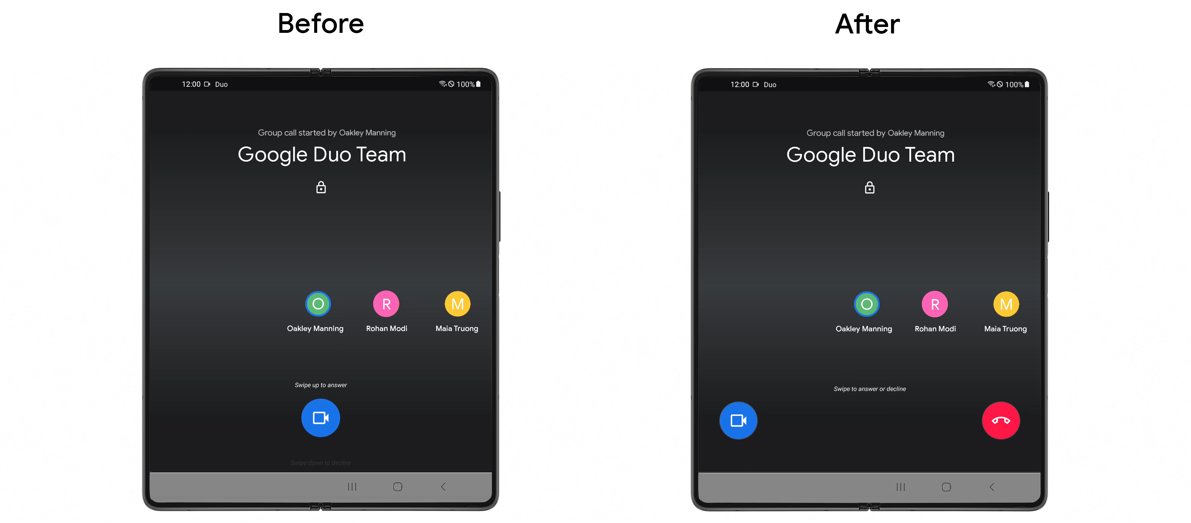 L'équipe a ensuite réfléchi aux interactions des utilisateurs avec Duo sur toutes les tailles d'écran. Si balayer l'écran pour répondre à un appel fonctionne très bien sur un téléphone, l'équipe de développement a constaté lors des tests que ce n'était pas le cas sur une tablette ou un appareil pliable. Certains utilisateurs Duo répondaient involontairement à des appels téléphoniques et devaient raccrocher rapidement. L'équipe a optimisé l'expérience sur grand écran en implémentant des boutons sur les tablettes et des curseurs doubles sur les appareils pliables.Elle a surveillé de près les changements de comportement suite à cette amélioration de l'UI et a constaté une diminution des appels brefs involontaires et une augmentation de la durée des appels sur ces appareils. Cette modification de l'UI a permis aux utilisateurs de Duo de bénéficier d'une expérience d'appel plus fluide.