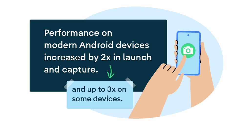 Usar o CameraX levou a Microsoft a uma melhor inicialização e captura de desempenho em comparação com o Camera1. O desempenho deles em dispositivos Android modernos dobrou no lançamento e na captura, e alguns aparelhos até triplicaram a performance (embora isso varie de acordo com o dispositivo). Além disso, ativar a funcionalidade de verificação principal foi mais fácil em comparação com as estimativas do Camera2. Em termos de fragmentação de dispositivos, o CameraX esconde muitas variações do Camera2 de muitos dispositivos na implementação em muitos dispositivos OEM.