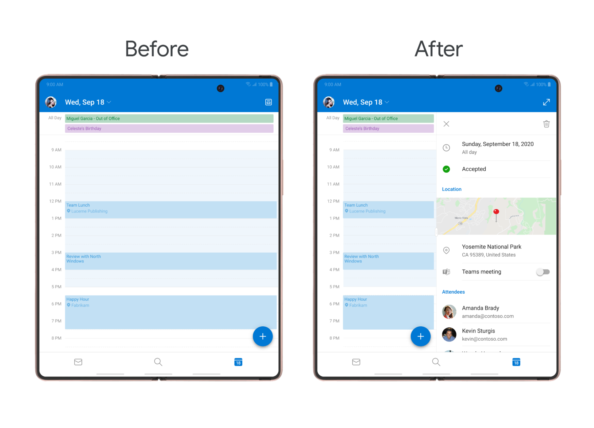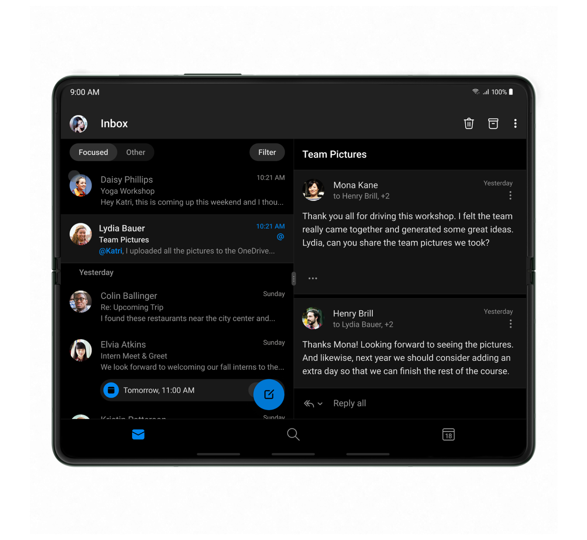 A Microsoft começou otimizando os layouts para se adequarem melhor à tela grande, usando o layout de detalhes e listas para ver uma lista de e-mails ao lado de um e-mail expandido no Outlook. Em um dispositivo dobrável ou tablet, as duas visualizações são mostradas lado a lado ou no modo de painel duplo, separadas por um divisor vertical. Agora os usuários podem fazer a triagem da caixa de entrada e da agenda sem precisar alternar entre as visualizações da caixa de entrada e da conversa.