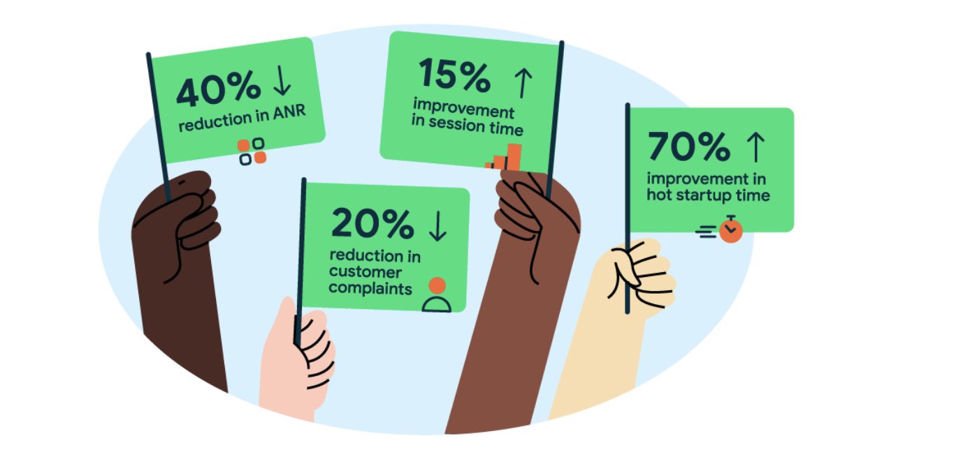 - ירידה של 20% במשוב מהמשתמשים לגבי איטיות האפליקציה, קריסות ומקרי ANR. התרגום הזה הוביל ישירות לשיפור של 15% במשך הסשן של המשתמשים