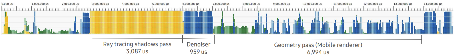 Işın izleme gölgeleri, ışık ışınlarını doğrudan yüzeylerden ışık kaynaklarına izleyerek geleneksel gölge haritalarına kıyasla daha yüksek doğruluk sunar. İşlem, derinlik ön geçişi, ışın sorgusu gölgeleri, gürültü giderme ve ışıklandırma geçişine entegrasyon içeriyordu. Titreşimli tek bir ışın ve ardından gürültü giderme işlemi kullanılarak yumuşak gölgeler verimli bir şekilde elde edildi. Ekip, yansımalar için G-buffer geçişi, ışın izleme yansıması ve isabet verisi depolama, malzeme kimliği dönüşümü, çözümleme geçişi (yansıtılan görüntünün oluşturulması) ve birleştirme geçişi (yansıtmaları ana sahneye entegre etme) içeren çok aşamalı bir işlem uyguladı. CPU geri yazma, karo yaklaşımları, örnek gruplandırma ve eşzamansız AS derlemeleri gibi optimizasyonlar, mobil cihazlardaki bu işlemlerin yoğun kaynak kullanımı sorununu gidererek performansı önemli ölçüde iyileştirdi ve iş yükünü azalttı.
