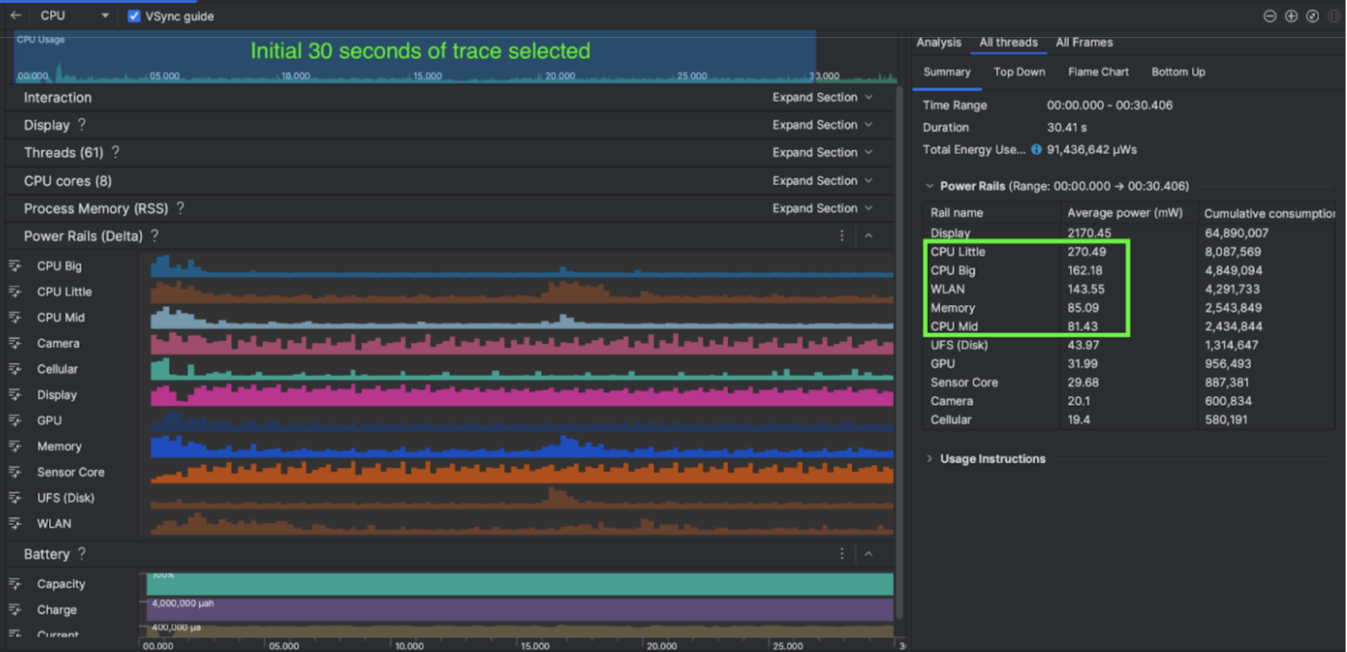 | power.rail.cpu.little | Alto | 30 | Bajo | 438.662 mW | 13.60% |