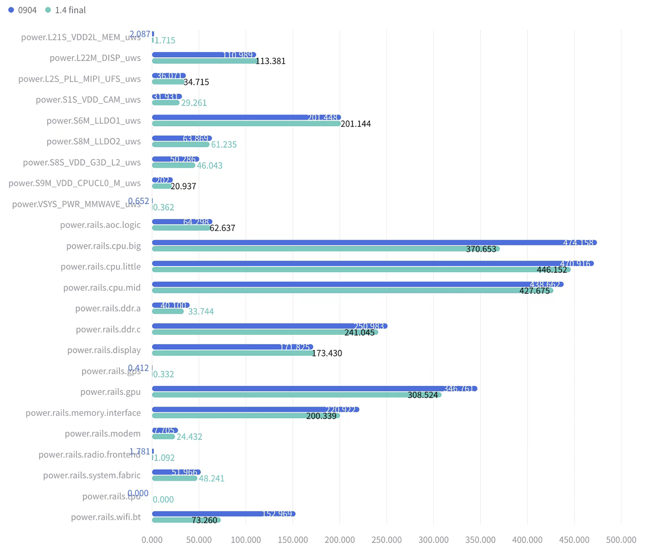| power.rail.cpu.mid | Alto | 30 | Bajo | 470.916 mW | 14.60% |
