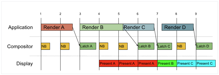הספרייה Frame Pacing פותרת את הבעיה הזו באמצעות שימוש במחסומי סנכרון (EGL_KHR_fence_sync ו-VkFence) כדי להחדיר לאפליקציה השהיות שמאפשרות לצינור עיבוד הנתונים של המסך להתעדכן, במקום לאפשר ללחץ חוזר להצטבר. עדיין יש מסגרת נוספת בפריים א', אבל המסגרת ב' מוצגת עכשיו בצורה תקינה.