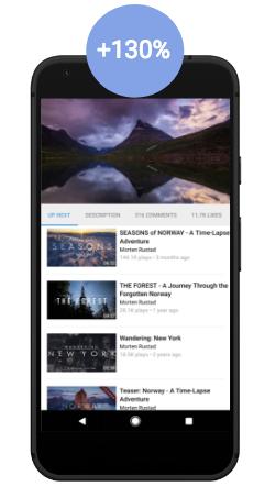 Die Instant-App von Vimeo hat das vertraute Erscheinungsbild der optimierten Android-App. Seit der Einführung im Mai 2017 hat sich die Sitzungsdauer bei Vimeo mehr als verdoppelt (+130% Steigerung) und die Anzahl der Nutzer der nativen App ist um 20 % gestiegen. Im Vergleich zur mobilen Website von Vimeo ist die Strategie für Installationsaufrufe in der Sofort-App weniger aggressiv. Die Installationsrate ist jedoch gleich (~10%). So wird für einen reibungsloseren Ablauf beim ersten Start gesorgt, ohne dass die Anzahl der Installationen sinkt.