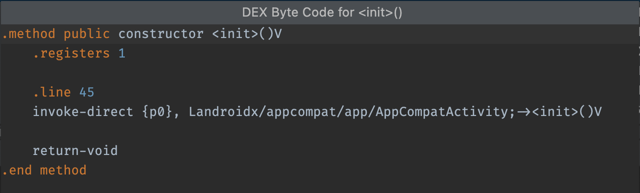 Hiện mã byte: Biên dịch ngược lớp, phương thức hoặc trường đã chọn và cho thấy nội dung biểu diễn mã byte smali trong một hộp thoại, như sau: