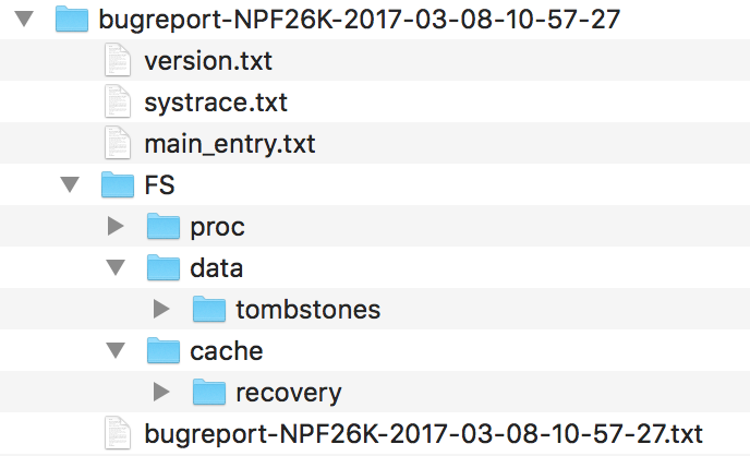 $ adb shell ls /bugreports/ bugreport-foo-bar.xxx.YYYY-MM-DD-HH-MM-SS-dumpstate_log-yyy.txt bugreport-foo-bar.xxx.YYYY-MM-DD-HH-MM-SS.zip dumpstate-stats.txt