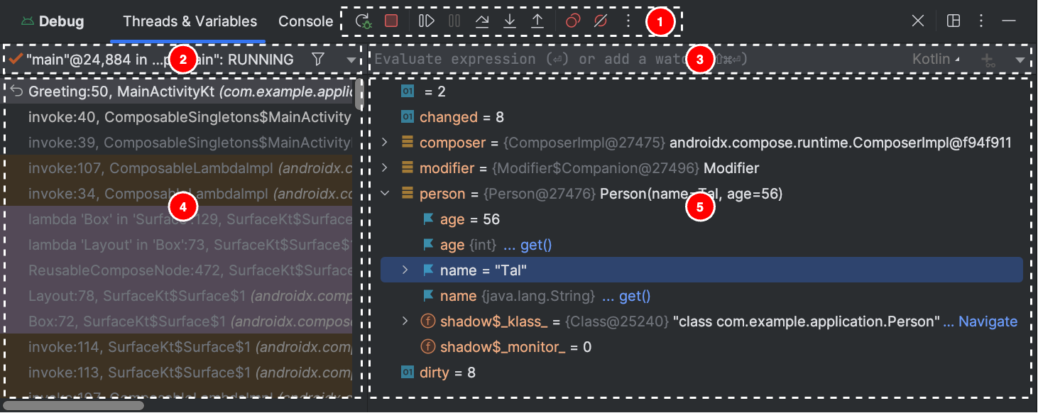 - Titik henti sementara metode menjeda eksekusi aplikasi saat memasuki atau keluar dari metode tertentu. Saat dijeda, Anda dapat memeriksa variabel, mengevaluasi ekspresi, kemudian melanjutkan eksekusi baris demi baris untuk menentukan penyebab error runtime. Saat Anda menetapkan titik henti sementara pada fungsi composable, debugger akan mencantumkan parameter composable dan statusnya untuk membantu mengidentifikasi perubahan yang mungkin menyebabkan rekomposisi.