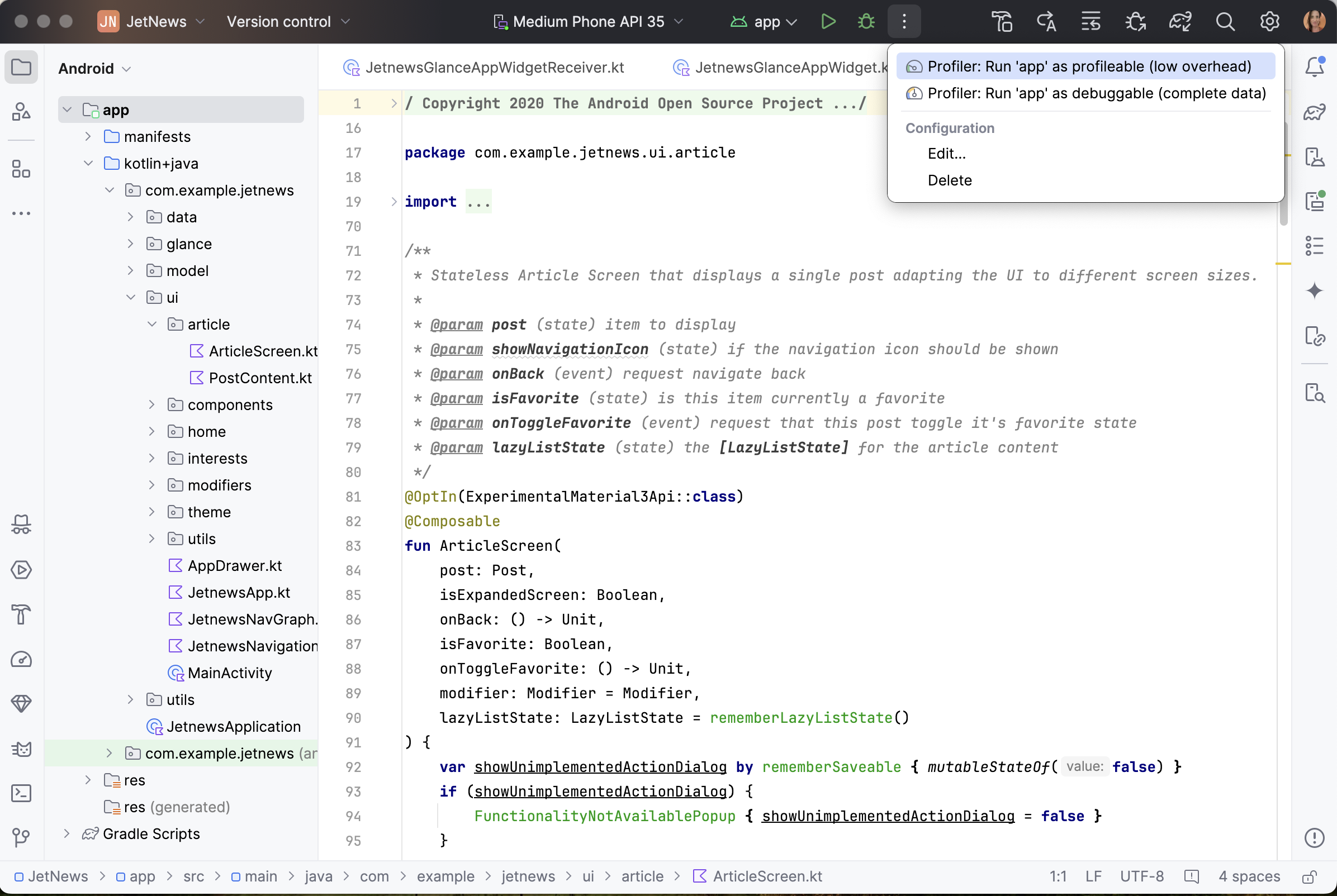 As configurações de execução e as ações de criação de perfil foram simplificadas em um novo widget de execução, e as ações de criação de perfil foram movidas para um menu de overflow.