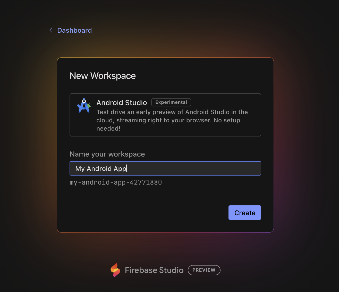 | Prueba Android Studio Cloud y asigna un nombre a tu espacio de trabajo. |