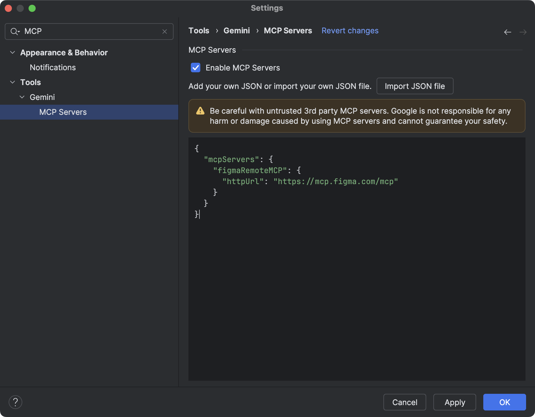 Ab Android Studio Otter 1 Canary 3 können Sie über Android Studio eine Verbindung zu Remote-MCP-Servern herstellen. Mit einem Remote-MCP-Server kann der Gemini in Android Studio-Agent auf externe Tools und Ressourcen zugreifen. Außerdem müssen Sie den Server nicht selbst installieren und warten. Sie können beispielsweise eine Verbindung zum Remote-MCP-Server von Figma herstellen, um auf Figma-Dateien zuzugreifen, ohne die Desktop-App von Figma installieren zu müssen. Weitere Informationen zum Hinzufügen eines MCP-Servers finden Sie unter MCP-Server hinzufügen.