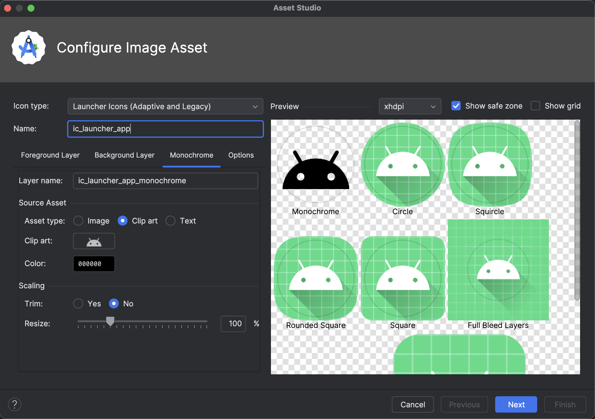 Zur Unterstützung dieser Funktion ist in Android Studio eine neue Option für monochrome Symbole direkt in den Image Asset Studio-Assistenten integriert. Wenn Sie ein adaptives App-Symbol erstellen, sehen Sie jetzt neben den vorhandenen Tabs Vordergrund und Hintergrund einen eigenen Tab Monochrom. Sie können entweder ein separates monochromatisches App-Symbol bereitstellen (siehe Designspezifikationen) oder Android Studio die Vordergrundebene des adaptiven Symbols für die monochrome Ebene wiederverwenden lassen.