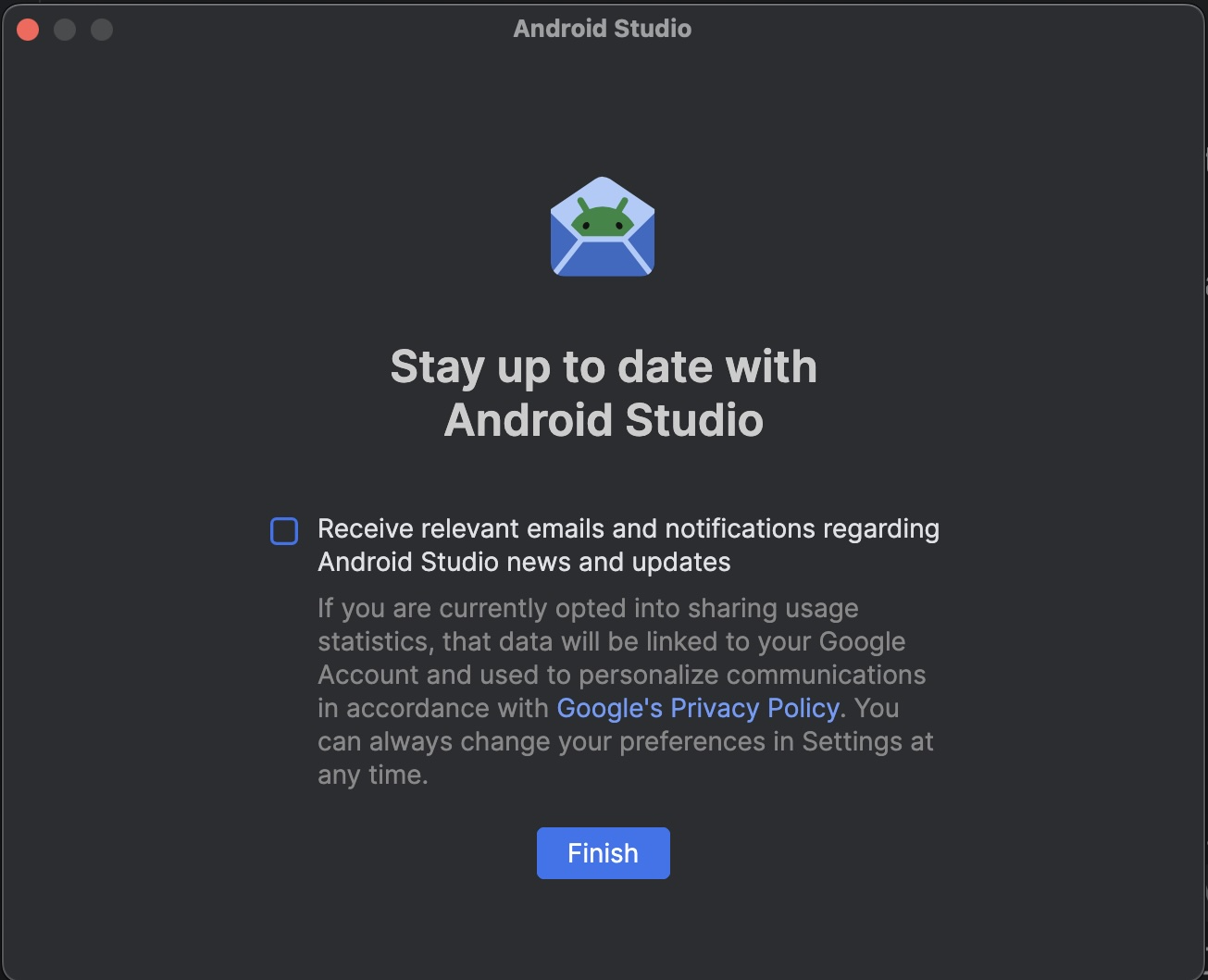 In Android Studio Otter 1 Canary 3 und höher gibt es eine neue Option, mit der Sie sich für Mitteilungen von unserem Team anmelden können. So erhalten Sie relevante E‑Mails und Benachrichtigungen zu Updates und neuen Funktionen in Android Studio. Diese Option wird angezeigt, wenn Sie sich anmelden.
