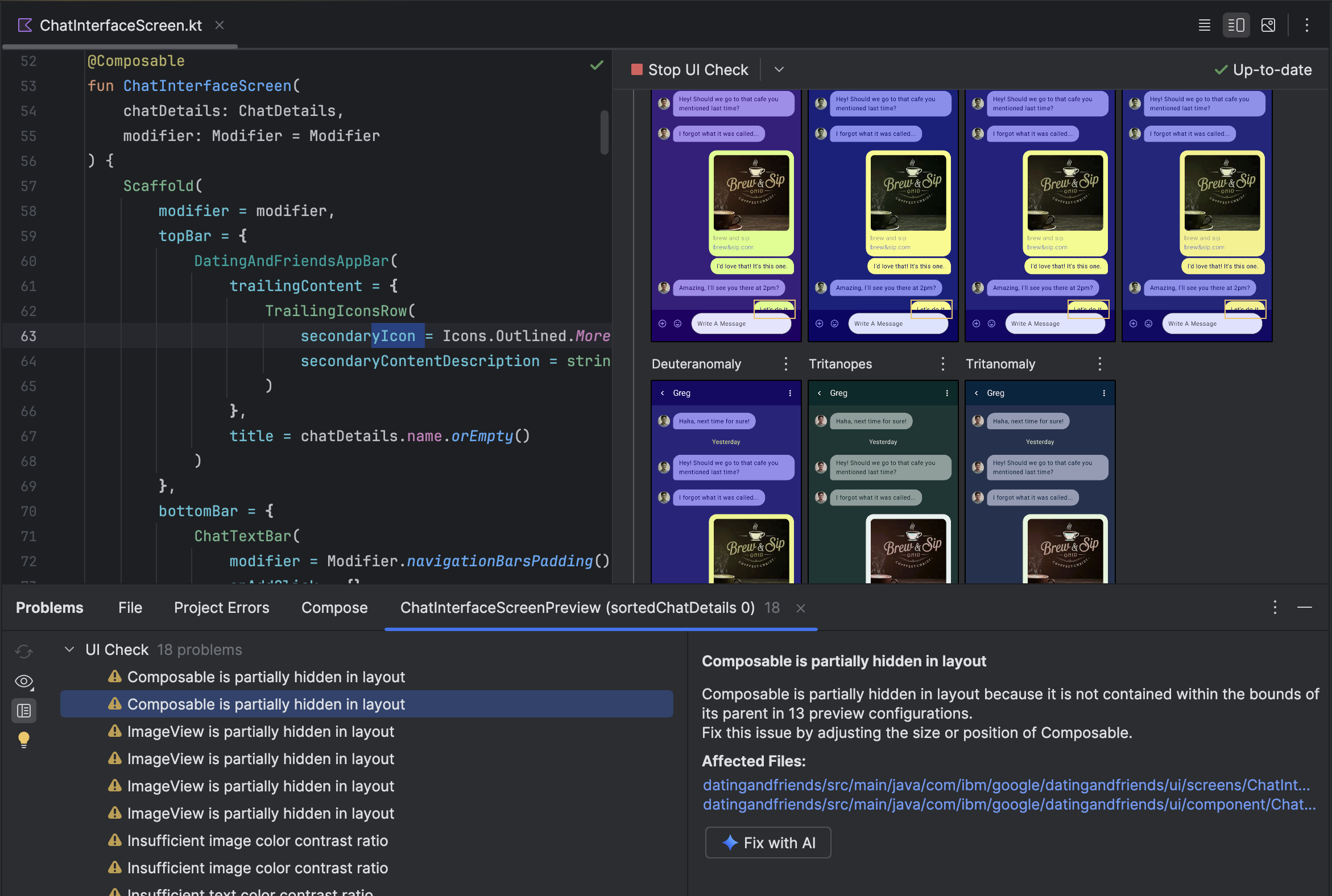 Sie können dieselbe Funktion auch über die Schaltfläche Mit KI korrigieren im Compose-UI-Prüfmodus aufrufen: