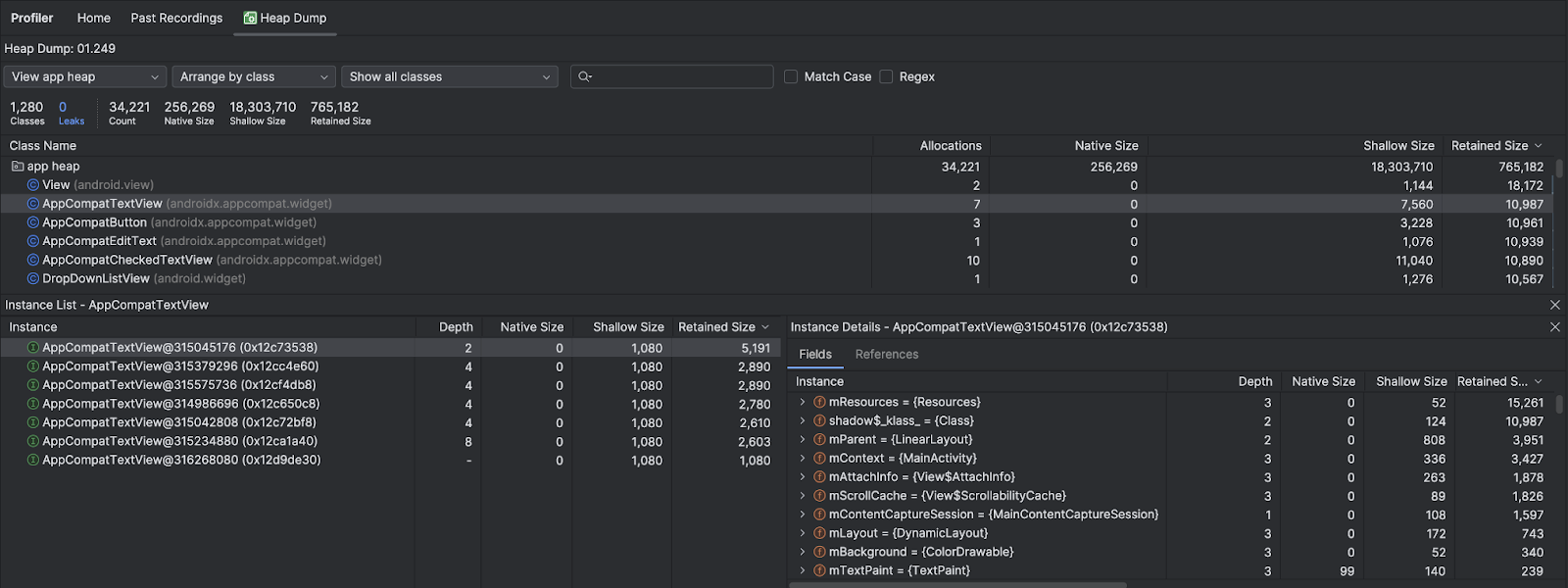 When you find potential memory leaks, use the Fields and References tabs in Instance Details to jump to the instance or source code line of interest.