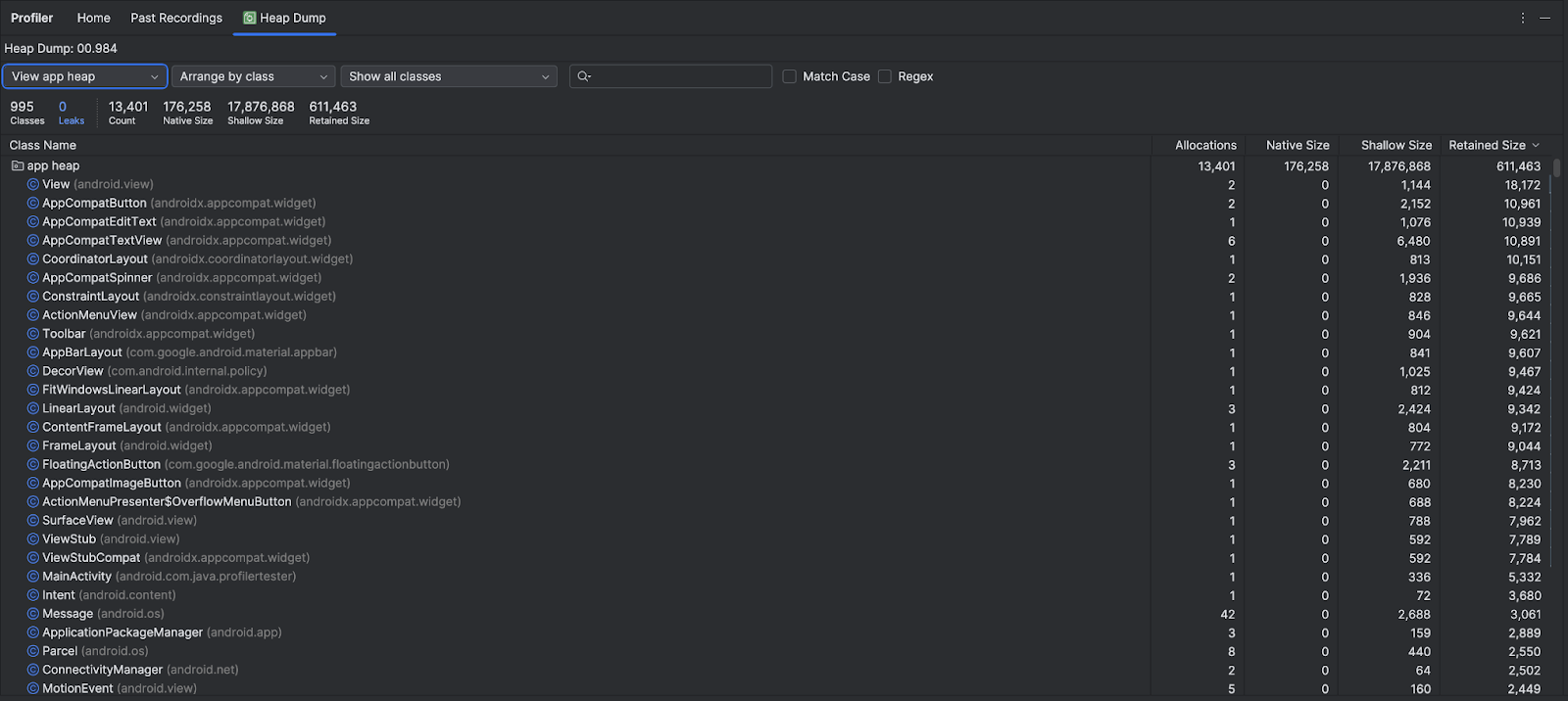 To quickly filter to classes that might be associated with memory leaks, open the class drop-down and select Show activity/fragment leaks. Android Studio shows classes that it thinks indicate memory leaks for Activity and Fragment instances in your app. The types of data that the filter shows include the following: