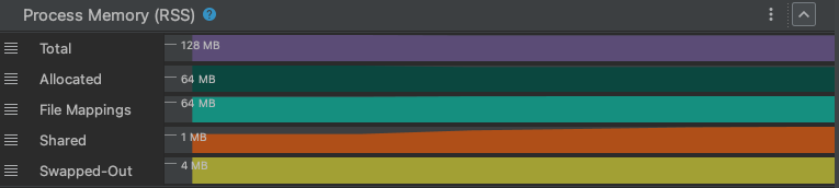 هذا هو المقدار الإجمالي للذاكرة المادية التي تستخدمها حاليًا عمليتك. في الأنظمة التي تعمل بـ Unix، يُعرف ذلك باسم "حجم مجموعة المقيمين"، وهو تركيبة من كل الذاكرة المستخدمة من خلال عمليات التوزيع المجهولة، وتعيينات الملفات، وتوزيعات الذاكرة المشتركة.