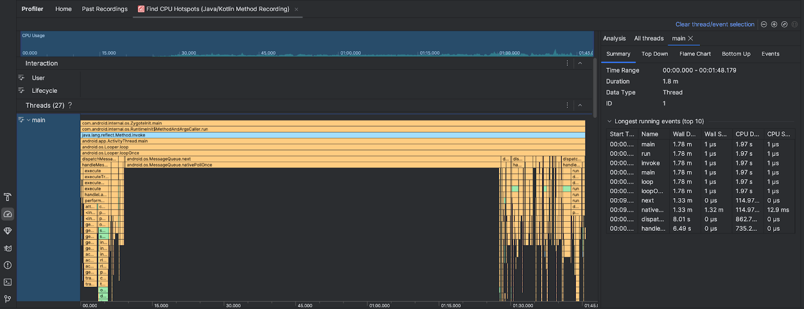 CPU sıcak noktalarını bulma görevini çalıştırdıktan sonra Android Studio Profiler aşağıdaki bilgileri sağlar:
