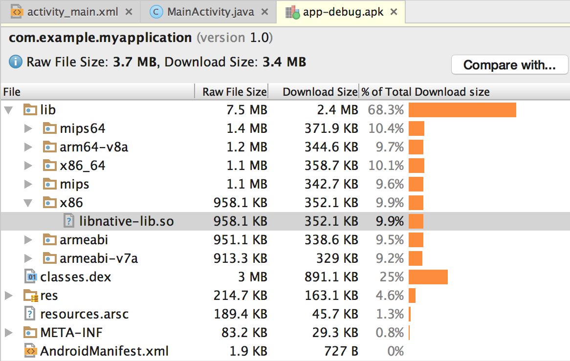 Để xác minh rằng Gradle đã đóng gói thư viện gốc trong ứng dụng, hãy sử dụng Công cụ phân tích APK: