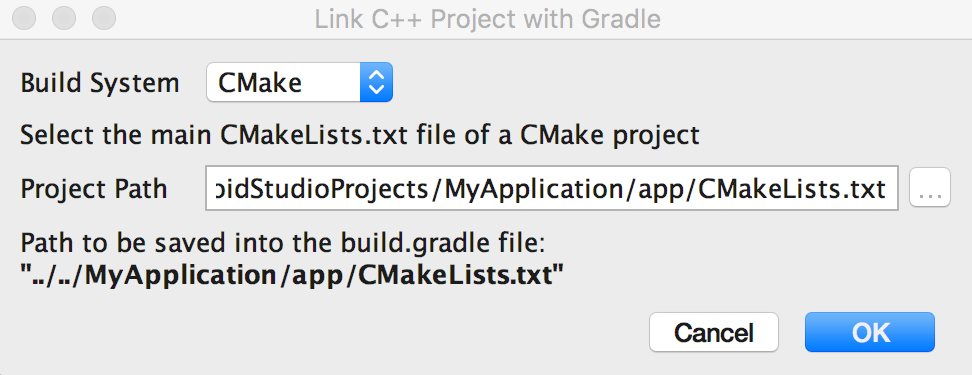 图 4. 使用 Android Studio 对话框关联外部 C++ 项目。