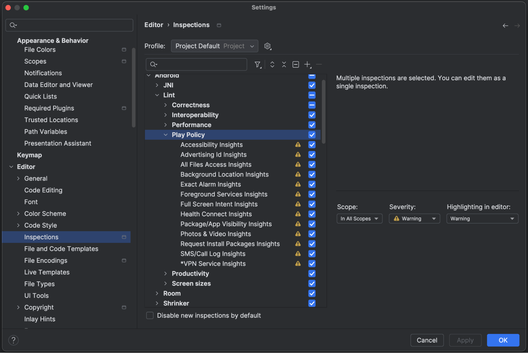 Bạn có thể tắt các chế độ kiểm tra lỗi mã nguồn cho tính năng Thông tin chi tiết về chính sách của Play bằng cách bỏ đánh dấu các chế độ này trong hồ sơ kiểm tra mặc định. Để làm việc này, hãy chuyển đến phần File > Settings > Editor > Inspections (Tệp > Cài đặt > Trình chỉnh sửa > Kiểm tra) (trên Windows/Linux) hoặc Android Studio > Settings > Editor > Inspections (Android Studio > Cài đặt > Trình chỉnh sửa > Kiểm tra) (trên macOS). Tại đây, bạn có thể tắt từng chế độ kiểm tra Thông tin chi tiết về chính sách của Play trong phần Android > Lint > Play Policy (Android > Lint > Chính sách của Play).