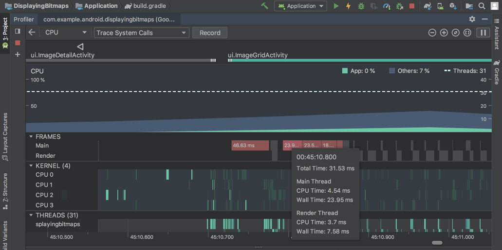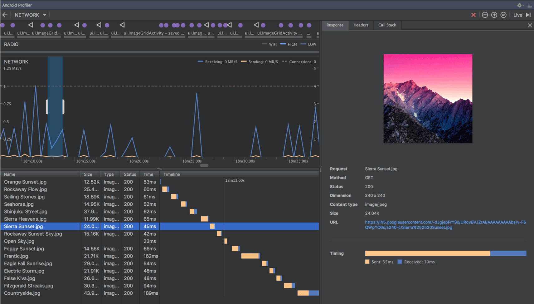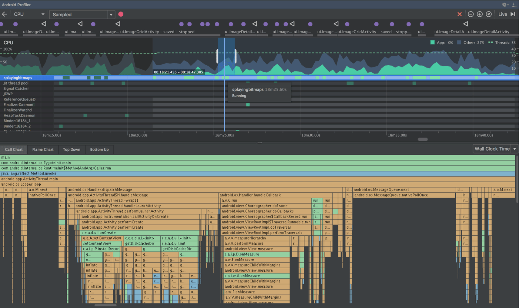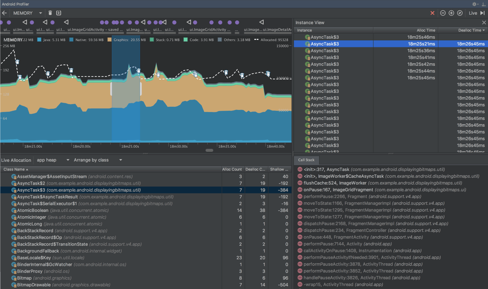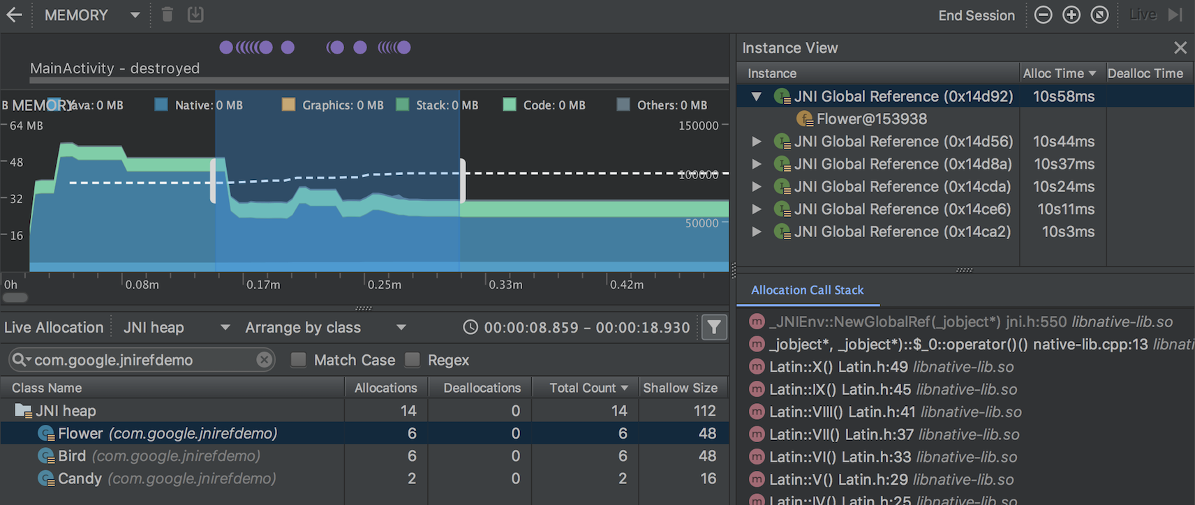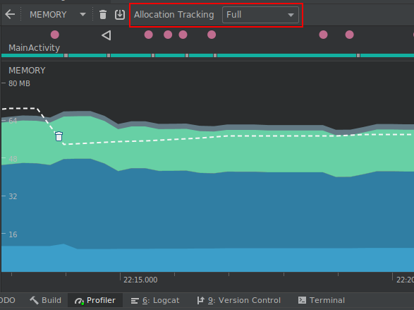 Lorsque vous analysez une empreinte de mémoire dans le Profileur de mémoire, vous pouvez à présent filtrer les données de profilage qui, selon Android Studio, peuvent indiquer des fuites de mémoire pour les instances Activity
