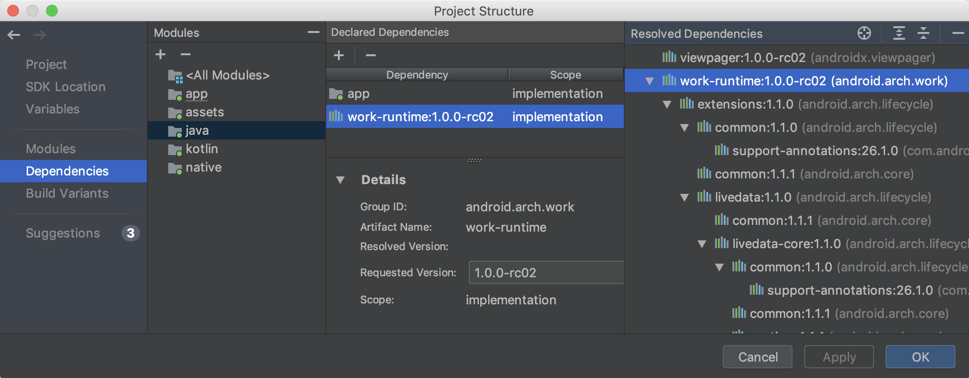 .Remarque : Les dépendances réservées aux tests ne sont actuellement pas compatibles avec Jack (Java Android Compiler Kit).