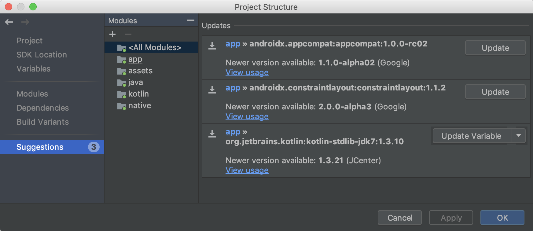 Il est maintenant possible de joindre des sources d'APK externes Kotlin uniquement lorsque vous profilez et déboguez des APK prédéfinis. Pour en savoir plus, consultez Joindre des sources Kotlin/Java.