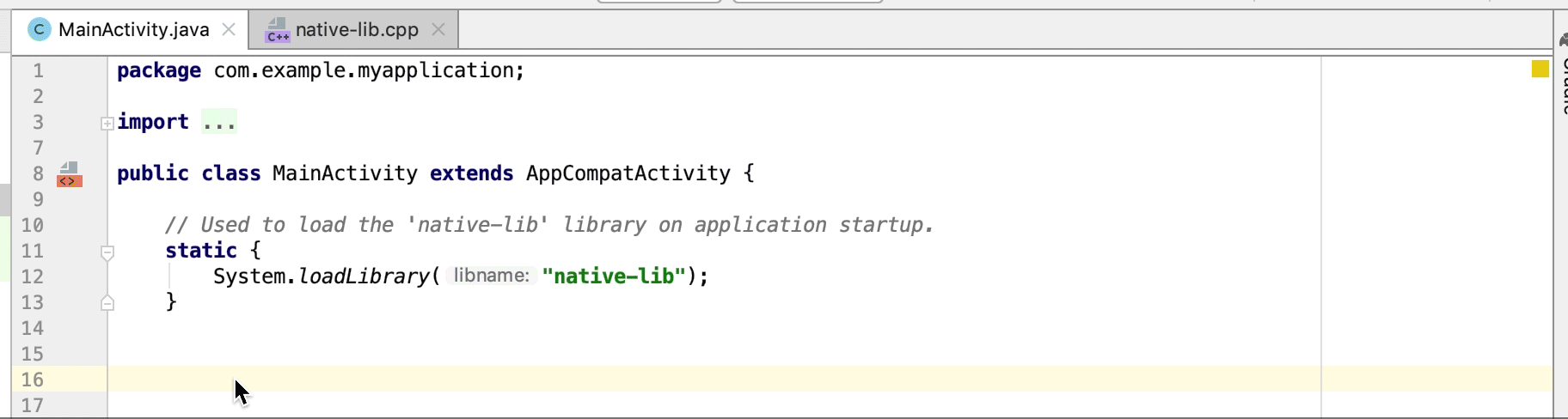 Passez d'une déclaration JNI à la fonction d'implémentation correspondante en C/C++. Pour afficher ce mappage, pointez sur le repère d'élément C ou C++ près du numéro de ligne dans le fichier de code source géré.