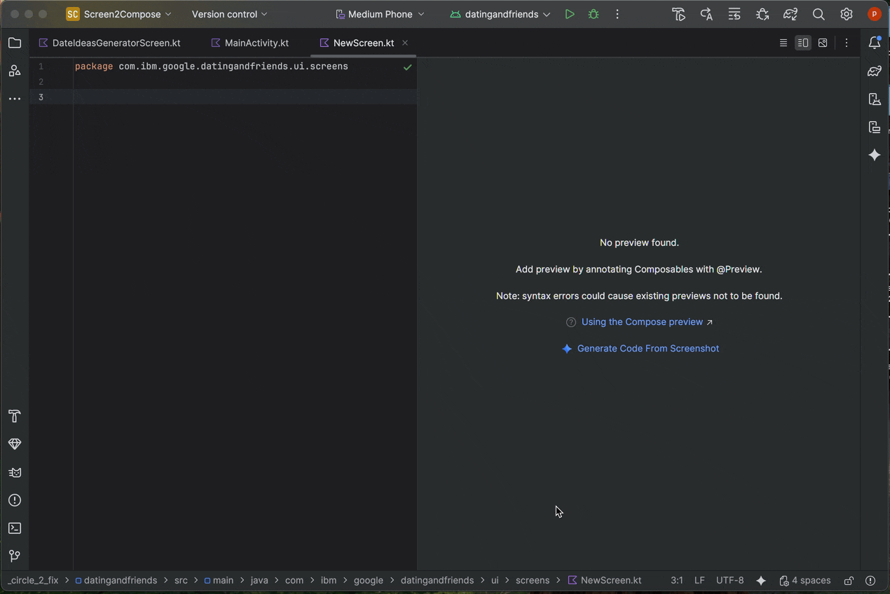 UI 開発プロセスの開始を加速するため、デザイン モックから直接 Compose コードを生成できるようになりました。既存のプレビューがないファイルで、プレビュー パネルの [Generate Code From Screenshot] をクリックします。Gemini は、提供された画像を使用して実装の開始コードを生成するため、ボイラープレート コードをゼロから記述する必要がなくなります。