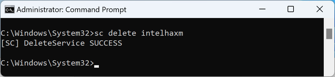 Delete Intel HAXM service by running 'sc delete intelhaxm'. You should see the following output.
