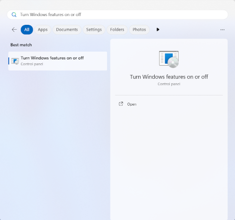 Using the search bar, type in Turn Windows features on or off.