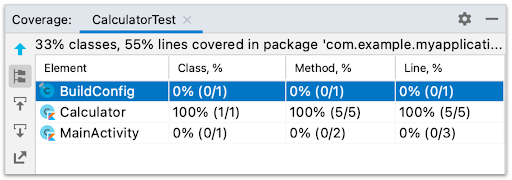 テスト カバレッジ ツールは、ローカル単体テストで、単体テストによりカバーされたアプリコードの割合と領域をトラッキングするために使用します。テスト カバレッジ ツールを使用すると、アプリを構成する要素、クラス、メソッド、コード行が十分にテストされたかどうかを確認できます。