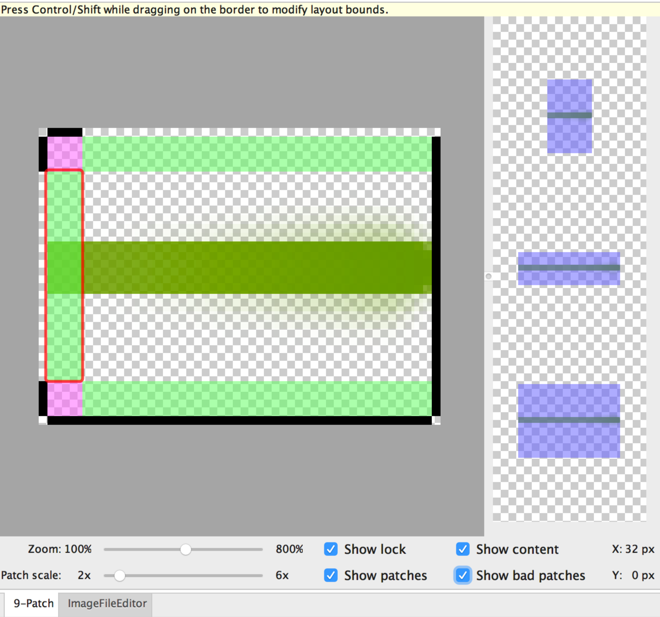 Figura 2. Imagem NinePatch no Android Studio mostrando conteúdo, patches e patches inadequados.