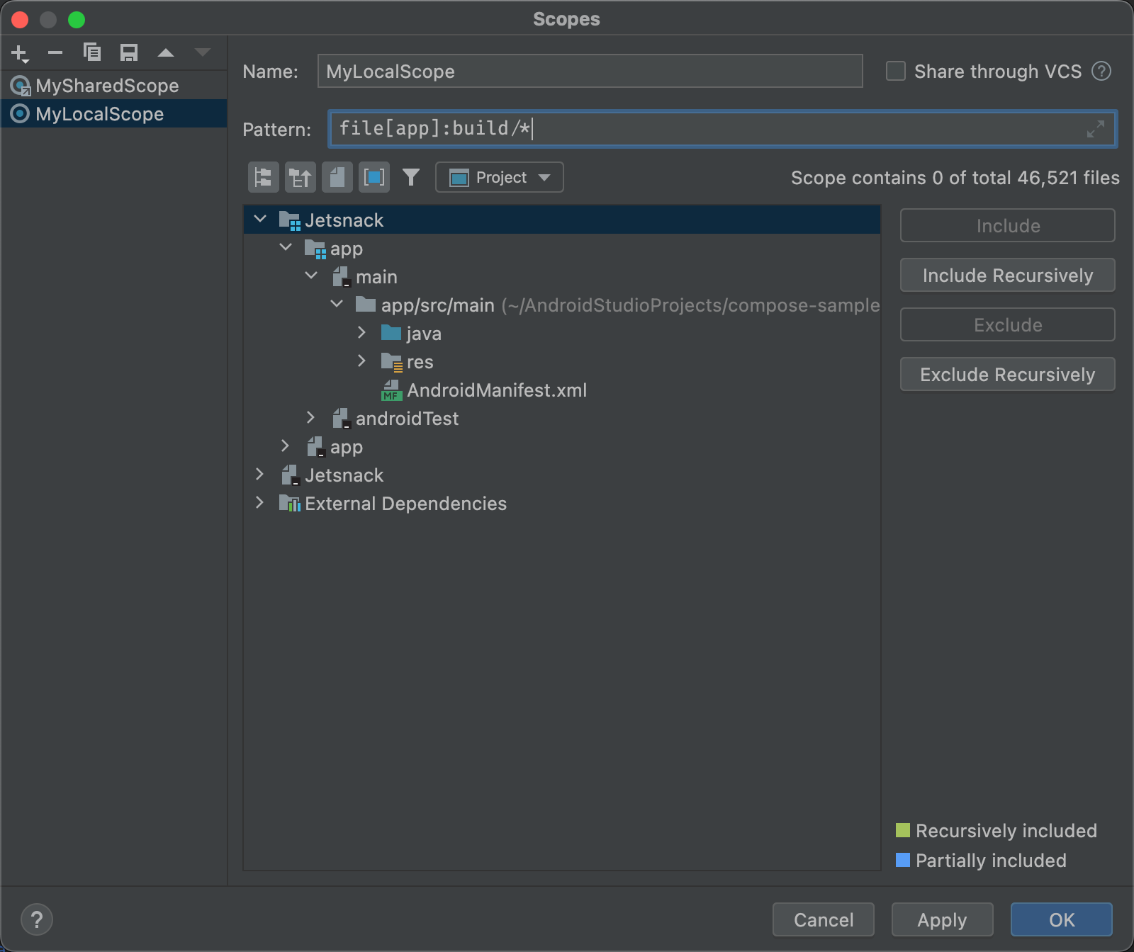 로컬 범위와 공유 범위는 모두 프로젝트 내에서 Inspect Code 기능에 사용됩니다. Shared 범위는 범위 필드가 있는 다른 프로젝트 기능에서도 사용할 수 있습니다. 예를 들어 Edit Settings