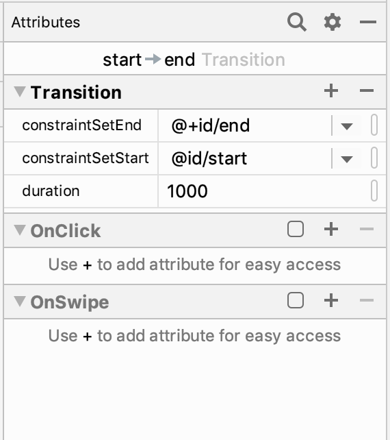 如要為圖形建構更多元素,您可以使用建立圖示快速新增 ConstraintSet、Transition 或 OnClick/OnSwipe 手勢。
